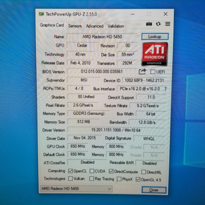 MSI Radeon HD 5450 HD5450 512MB GDDR3 64 Bit